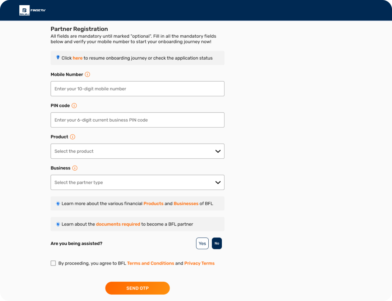 - If you are referred by a BFL employee or any existing BFL partner, click 'YES' to answer 'ARE YOU BEING ASSISTED?'
