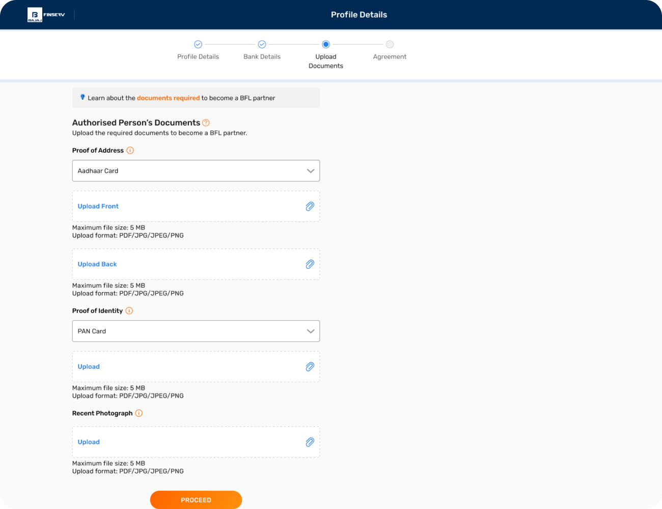 Yes, you need to upload the required documents recognised by the government of India to sign the legal agreement and become a partner with Bajaj Finance Limited.