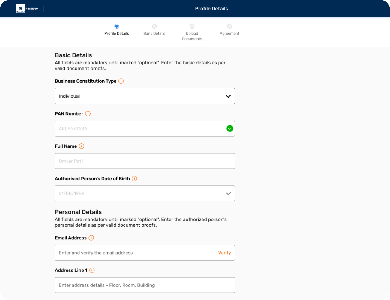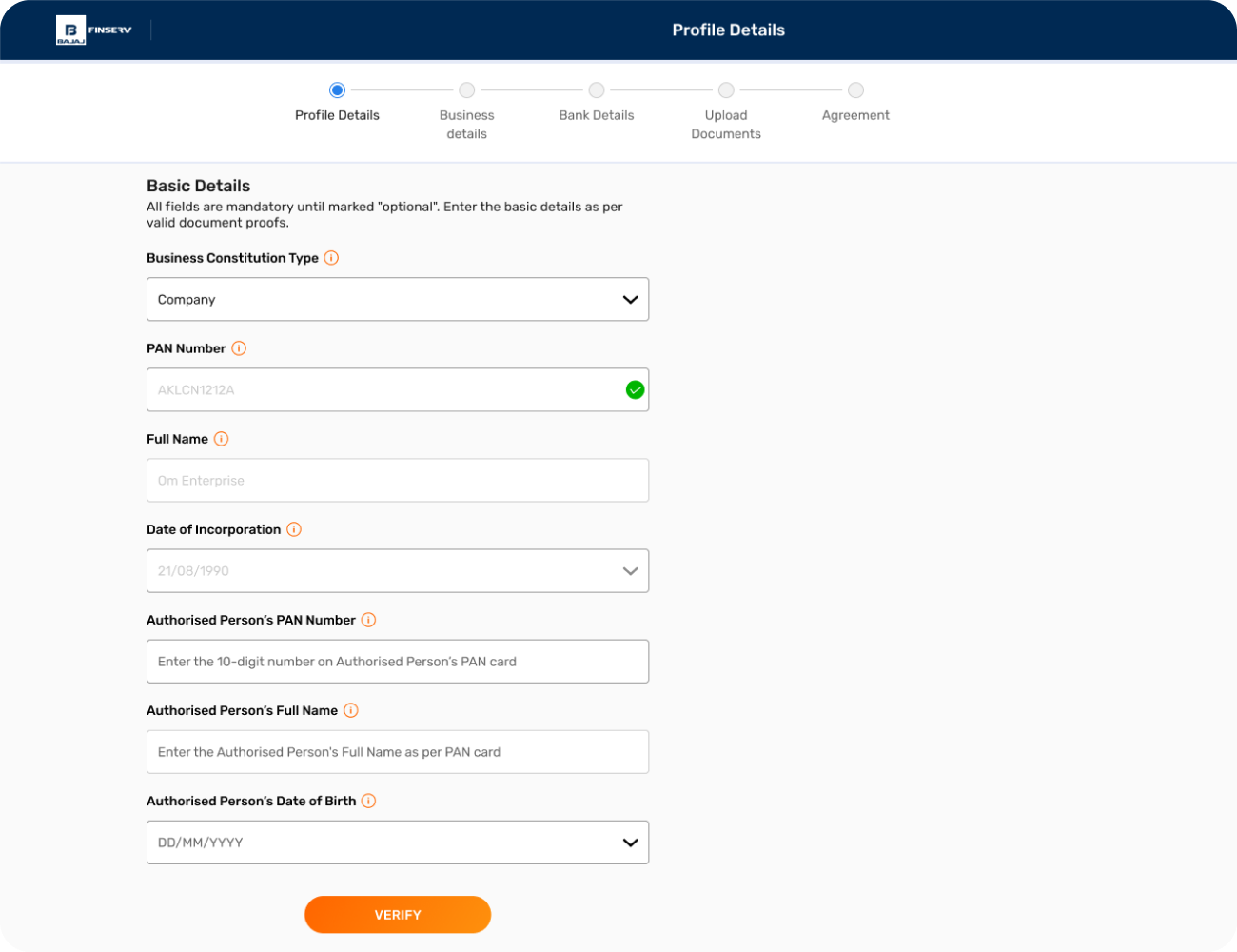 - Enter your business PAN and click 'VERIFY' to auto-fetch full name. If you do not have a business PAN, enter your personal PAN