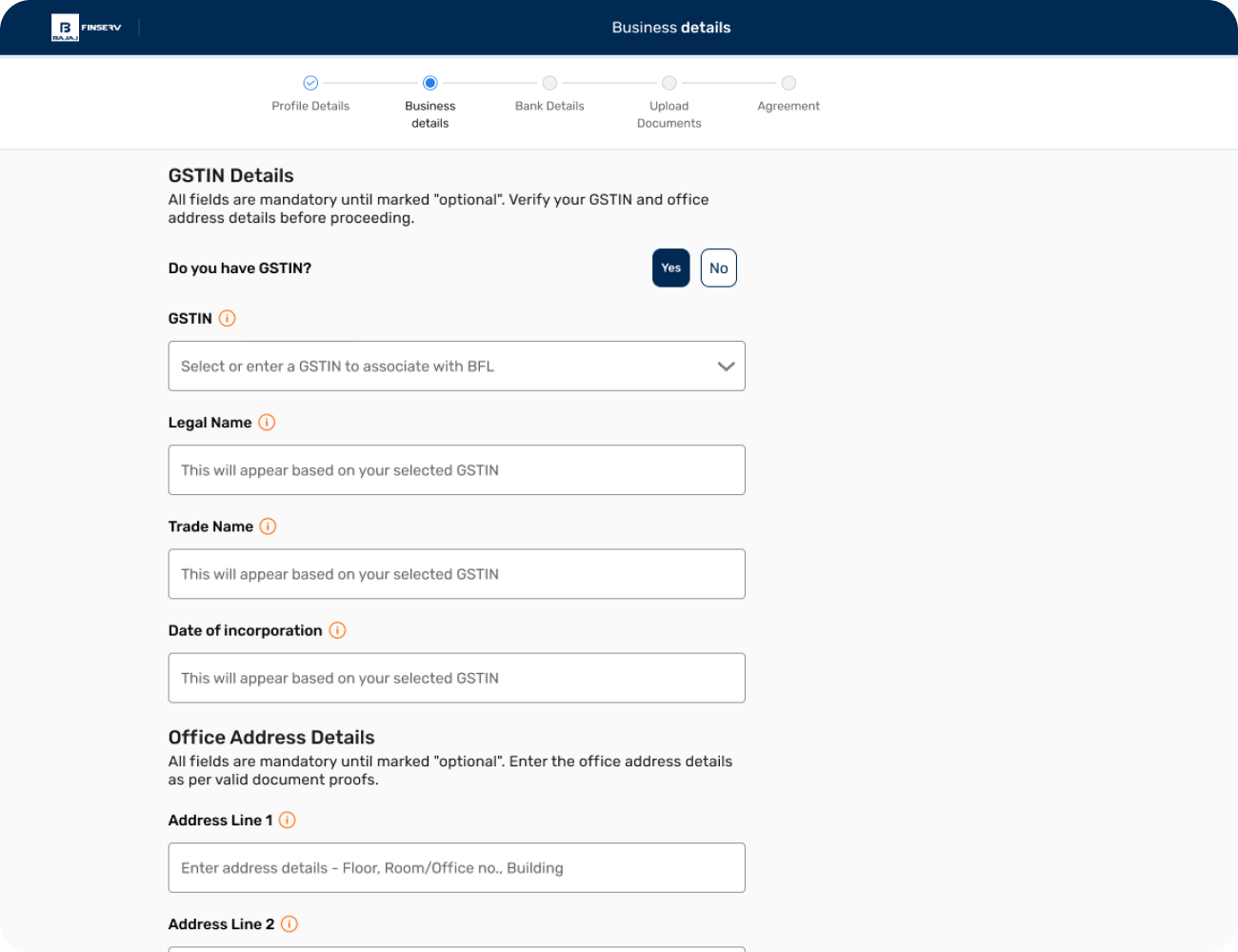 - Your business' legal name, trade name, and date of incorporation will be auto-fetched based on your entered GSTIN